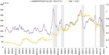 再次,微观层面上,市场观望情绪升温。人民币单边贬值预期形成后,每次人民币阶段性的回涨,总伴随着即期询价成交量的萎缩,意味着在当时阶段,市场对人民币后市能否续涨存疑,因而持观望态度。1月的情况仍然如此。当然,2017年12月4日,外汇交易中心推出美元兑人民币即期撮合交易后,即期询价成交量已整体下滑,因此与此前数据不具有可比性。但1月成交量逐日萎缩,反映出当前人民币的上涨“有价无量”,市场交投谨慎,观望情绪浓重。(图6)