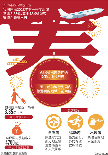 据国家旅游局数据中心调查显示:我国居民2018年第一季度出游意愿为83%,其中48.9%的游客选择在春节出行。图/CFP