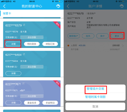 95533答:您可登录建行手机银行,进入首页“财富”菜单,选择需查询的储蓄卡,依次点击“详情-更多-管理境外交易”即可查询储蓄卡境外交易功能开通情况。除可以通过手机银行查询外,您还可通过建行电话银行、个人网银等渠道查询。