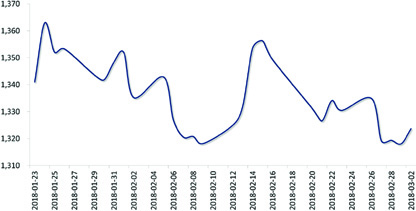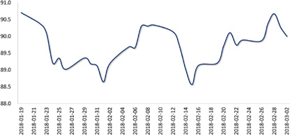 上周,美元指数先涨后跌,周初美联储新任主席鲍威尔在国会证词讲话基调“鹰派”,导致市场对美联储年内加息四次预期升温,提振美指。但随后美国总统特朗普宣布对钢铝征收高额进口关税,引发市场对贸易战的担忧,美指回吐涨幅。人民币兑美元整体走贬,但结汇需求限制了人民币的下跌空间,短期料维持在【6.30,6.36】区间波动。周五人民币兑美元收于6.3472,当周累计下跌0.14%。