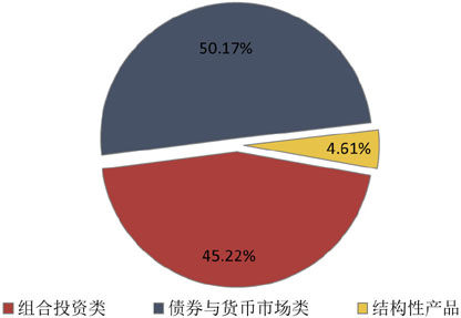 从投向类型来看,债券与货币市场类产品发行了4090款,环比减少1206款,市场占比减少0.68个百分点至50.17%;组合投资类产品发行了3687款,环比减少823款,市场占比上升1.92个百分点至45.22%;结构性产品发行了376款,环比减少234款,市场占比下降1.24个百分点至4.61%。(图4)