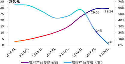 2017年,理财产品存续余额29.54万亿元,但受前期高基数、年内严监管的影响,同比仅小幅增加0.49万亿元,理财产品增速大幅下降22个百分点至2%。负债端理财增长乏力,并且理财余额在多个月份出现单月负增长的情况。