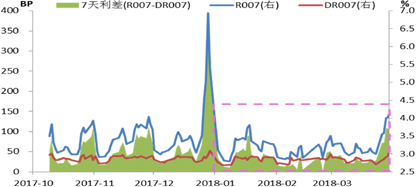 从季度内走势看,1月中旬、2月末和3月末出现资金阶段性紧张。1月中旬主要受年初信贷需求旺盛、缴税、缴准因素影响,2月末紧张是月末因素作用,3月末紧张是季末MPA考核导致银行减少对非银机构融出资金,导致全市场跨季资金利率大幅飙升。