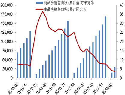 房地产:2018年1-3月商品房销售累计面积为30,088万平方米,累计同比增长也降至3.6%。目前银行的贷款利率在基准利率4.9%上折1.2至1.4倍,购房房贷压力增大,已经明显影响房产销售。其次,今年地产销售增速远超投资增速,降库存效果明显,低库存未必会补库存,因为目前政府租售并举的房地产政策相对以往更加明确。最后,国家限制“银行-信托”的资管通道,势必从源头限制资金流入房地产。销售的不振、资金的限制、新开工面积明显下降,必将影响铜和其他大宗商品需求。(图1)