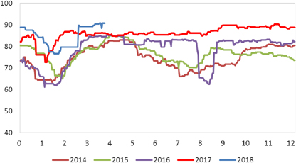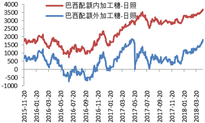 广西糖网数据显示,4月初时配额外巴西原糖加工利润在1365元/吨上下,配额外泰国糖加工利润在1565元/吨上下,此后国内外糖价都是下跌走势,但外盘跌幅较内盘更大,期间美元对雷亚尔大幅升值,使得国外原糖相对贬值,加工利润扩大。月末配额外巴西糖加工利润1813元/吨上下,配额外泰国原糖加工利润也在1981元/吨上下。海关数据显示,中国2018年3月份进口食糖38万吨,较去年同期增加8万吨(去年同期进口30万吨),3月份年度进口配额发放使得进口量大增。(图10)
