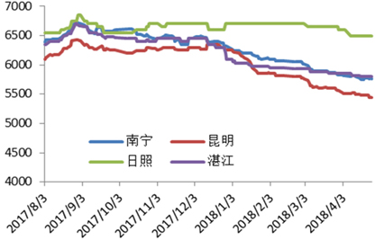 4月份,郑糖805合约的基差大幅上升。整个4月份现货一直处在缓慢下行的过程中,同期期货也是大幅下挫,只不过下跌幅度较现货要大一些,所以基差出现放大。南宁现货基差月初在170元/吨,月末涨至360元/吨,期货已经大幅贴水现货,这也是月末期货企稳的主要动力之一。