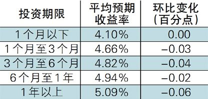 本月,市场资金面相比上月进一步宽松,除1周以内期限点外,其余各期限点Shibor利率环比均出现小幅下降。银行理财产品收益水平也随之继续下跌。本月人民币银行理财产品的平均预期收益率为4.81%,环比下降0.04个百分点。除1个月以内产品外,其他各期限类型理财产品收益水平均有所下降,其中1年以上期限类型理财产品跌幅最大,为0.06个百分点。(表1)