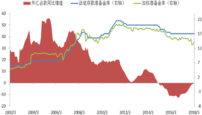 2003年、2004年、2006年至2008年上半年以及2010年至2011年这一阶段的存款准备金率上调均是为了对冲快速增长的外汇占款;