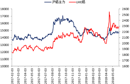 五月份铝价整体表现算是波澜不惊,继四月份大涨并冲高回落之后,五月铝价整体较四月末小幅反弹,波动性大大降低。前半月,市场再度受到宏观因素干扰,担忧特朗普在俄铝事件上继续采取制裁政策造成铝供应问题,铝价一路小幅反弹,攀升至14925元/吨;后半月俄铝事件再度出现转机,因奥列格同意将放弃对俄铝的控制权,同时传言海德鲁环保改造或完成,原本预期的复产时间或提前,市场对海外供应的担忧大大降低,铝价难以继续上冲,而是掉头向下。截至5月31日,沪铝主力报收于14590元/吨,月中最高至14925元/吨,最低至14500元/吨,月线小幅收涨0.76%,成交量有明显萎缩,减少243.9万手至372.5万手,持仓量略有增加1.6万手至24.3万手。(图1)