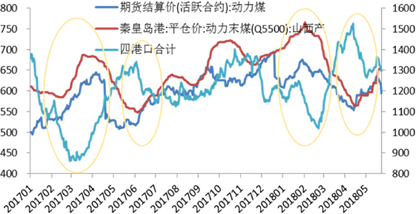 5月在旺季预期、港口库存下行、全国突发性持续高温等因素的作用下,动力煤期货、现货价格整体偏强,中旬受气温回落、发改委限价的影响,价格明显回落,近期情绪有所缓解,再度反弹,最终动力煤1809合约收于623.6元/吨,月涨幅为4.35%,1901合约收于628.2元/吨,月涨幅为3.80%。