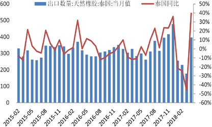 国内库存高企的问题依然没有太大改善。截至5月30日,上期所仓单已达44.52万吨,同比增长37.75%,环比增长4.1%,创纪录的高仓单将始终对09合约造成压制。值得注意的是,今年保税库存的去化速度是2015年以来最快的,特别是2月以后。其主要原因在于东南亚三国1季度的限制出口初始确实限制非常严格,阶段性到港大幅减少;此外目前沪胶期货升水继续收窄,套利意愿下降同样导致进口减少。从泰国4月的出口情况来看,未来几个月保税区库存压力又将逐渐显现。(图5)