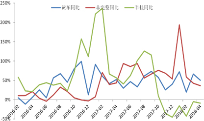 4月重卡销量再创新高,但半挂销量持续负增长,基本印证前期判断。根据汽车工业协会的数据,4月重卡销量12.82万辆,同比增长1.84万辆,增幅17.67%,再创新高。其中货车销量3.58万辆,同比增速50.20%;工程车销量4.14万辆,同比增速36.20%;半挂牵引车销量4.56万辆,同比下降9%。(图4)