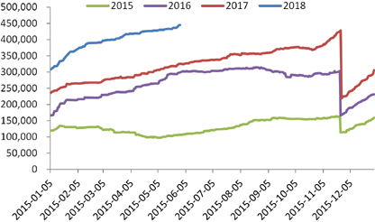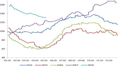 国内沿海进口菜籽总库存增加至60.8万吨,较去年同期的52.15万吨,增幅16.59%。其中两广及福建地区菜籽库存增加至41.8万吨,较去年同期38.1万吨增幅9.71%。目前跟踪的情况看,2018年5月菜籽到港量在48.3万吨,6月菜籽到港量在39.5万吨,到港量基本处于正常水平,原料供应暂时充裕。当前进口菜籽盘面压榨利润仍然较为可观,随着进口菜籽成本提高会间接提升国内菜油价格。