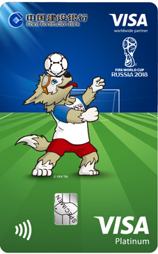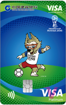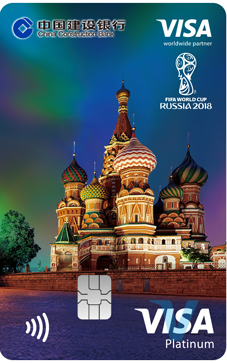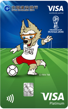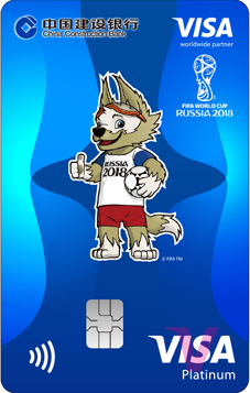 建行本届世界杯信用卡VISA龙卡FIFA世界杯信用卡(俄罗斯版)含四款设计独特、风格鲜明的经典版卡面,包含世界杯吉祥物、大力神杯及主办国风景等主题。金卡以世界杯至高无上的荣誉象征“大力神杯”为主题,标准白金卡则采用三款色彩亮丽的竖版卡面,分别是本届世界杯以西伯利亚平原狼为蓝本的吉祥物扎比瓦卡踢球、顶球的动感造型,以及主办地俄罗斯著名的圣瓦西里大教堂的美景。卡面设计凸显世界杯特色和举办地特色,彰显世界杯的独特魅力。卡片限时发行至2018年12月31日。