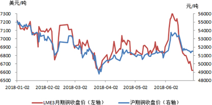 6月中旬美国突然宣布将对中国价值500亿美元的商品加征25%关税,有色金属整体明显下挫,当日伦铜跌逾3%,随着市场对中美贸易战担忧不断加大,铜价出现单边连续快速下跌。
