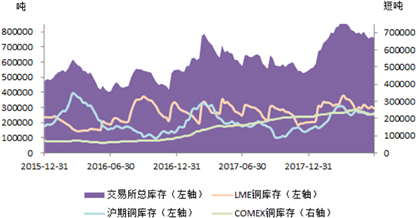 截至6月底,三大交易所库存76.2万吨,较去年底及去年同期都有明显提升,较高的库存水平也对铜价构成了压制。结构上看,伦铜库存同比基本保持稳定,沪铜和Comex铜库存出现明显增幅。若考虑到保税区库存有相应水平下降,则主要库存增量是在美国市场。Comex库存近两年保持稳定的增长,目前三大交易所库存水平基本接近。(图3)
