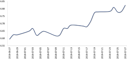 上周,美元指数V型反转。周三,因欧美贸易摩擦初步达成协议,欧元反弹,美元指数急跌0.4%;周四,欧洲央行公布利率决议,将维持低利率水平至明年夏天,欧元创下逾一个月来最大单日跌幅,美元指数顺势反弹,周五收于94.69,当周累计上涨0.23%。受国常会释放货币政策边际宽松信号影响,离岸人民币大幅下挫,在岸人民币跟随下行,盘中最低触及6.8390,创2017年6月27日以来新低,周五收于6.8246,当周累计下跌0.66%,预计人民币短期仍有调整压力。