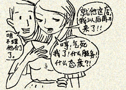 小明发现女友有些恼了,赶紧起身拉她离开。她还是忍不住说:“说什么顾客就是上帝啊!都是忽悠人的!”