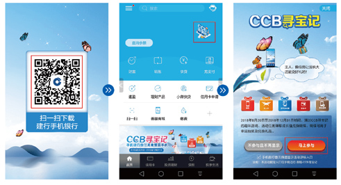 建行于2018年8月20日—2018年12月31日期间,面向所有用户创新开展主题为“CCB寻宝记—您的专属小任务”的手机银行优惠活动,用户报名后完成“天天签到”“购买速盈”“扫码收款”“申请快贷”等随机指定业务的过程中,便可自动获取活动成长值,积累一定成长值后便可兑换各种礼品。此外,活动还增设了“抓金币”游戏及“幸运大转盘”抽奖两大专区。