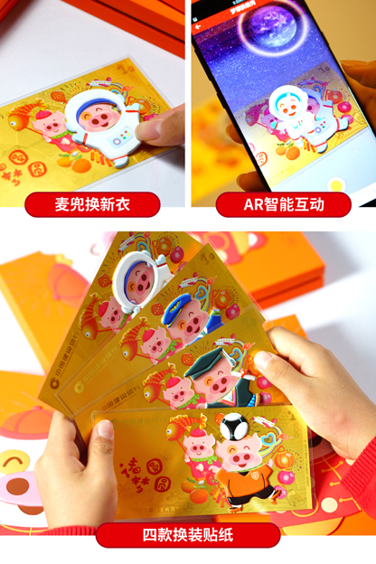 建行压岁金每年都在实现工艺升级的创新突破。AR智能科技和互动体验是今年压岁金的一大亮点。猪年压岁金特意为小朋友们准备了四款实体换装贴纸,让小朋友们亲手帮麦兜穿上“梦想战衣”,下载“我的压岁金”App扫描换装后的压岁金,就与不同职业的麦兜互动,科技感和互动性超棒的黄金压岁钱更受小朋友喜欢。
