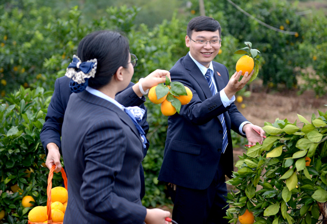 “看果形,个大型正!看颜色,橙红鲜艳!论内在,肉质脆嫩、化渣,浓甜芳香……”主题党日活动现场,青年女企业家赖秀英正挽过一片挂满金黄色硕果的脐橙枝,向一众鲜红党徽的人群介绍誉满全球的赣南脐橙。