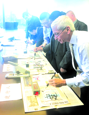 建行大学新春对联、微信祝福语征集活动,绽放中国传统文化魅力。图为建行大学纽约学院外籍员工与合作单位同事一起学写对联,礼赞建行大学。