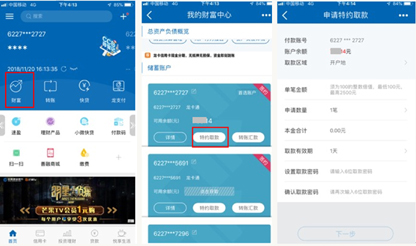 95533答:如您已签约开通我行手机银行服务,即可通过手机银行申请ATM无卡取款。申请流程:登录手机银行,点击“财富”,在储蓄卡账户栏位下点击“特约取款”,根据页面提示操作即可。申请成功后,您可在取款有效期内,凭特约取款号和取款密码至指定设备无卡取现。温馨提示:申请特约取款成功后,我行将立即从付款账户中扣除取款金额,您可查询账户明细了解资金变动情况。