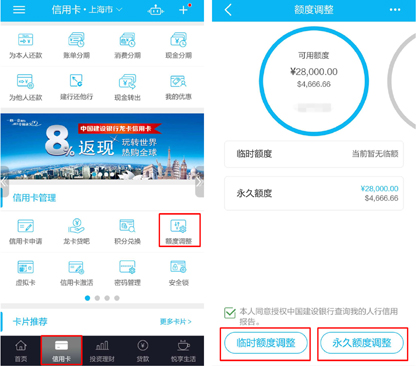 一不留神没注意?不妨申请临时额度,登录“中国建设银行”手机银行,点击“信用卡”-“额度调整”。