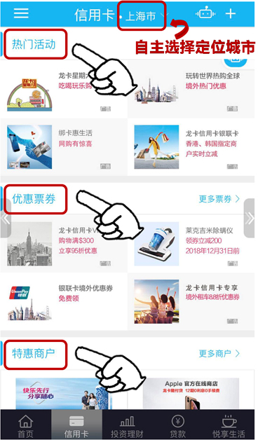 2.自主选择定位城市,点击“信用卡”-“热门活动/优惠票券/特惠商户”,便可将餐饮、购物、娱乐、出行等众多优惠一网打尽。