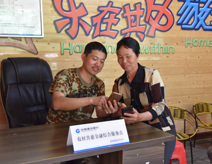 福建省南平分行设立“裕农通+益农信息社+退役军人”模式“村口银行”。“裕农通”退役军人业主余利静为赶集的大婶办理取款。