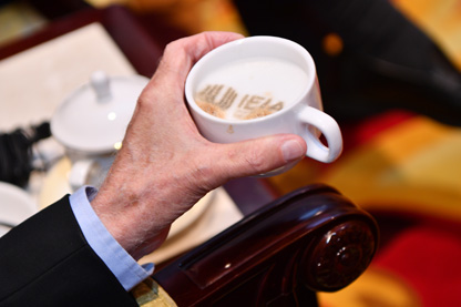 满是新金融人才产教融合联盟标志的背景墙,架起的摄像机,这可是记者们大显身手的舞台啊。媒体朋友们不放过每一个“新鲜”瞬间,在论坛间隙,忙着邀约嘉宾进行采访,“长枪短炮”一齐“开火”。一位嘉宾幽默地说:“我先来杯咖啡提提神,不然曝光度不足。”看这带有联盟标志拉花的咖啡,不喝都美醉了。