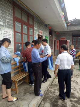 “大伙辛苦了,我们带了点小礼物。”老林说着话的同时用手指向放在旁边的雨伞、毛巾等小礼物,“‘劳动者港湾’是我们建行的特色项目,目的是为了给有需要的人提供力所能及的帮助,如果你们以后在外没水喝,可以到建行来清凉一下;如果你们找不到厕所,可以到建行来上个厕所;如果你们还有其他的需要,也可以到建行来,我们都全力以赴做到。”大伙听到后开始交头接耳,“来,快把小礼物分了吧,”老林指着那堆小礼物说道,村民开始有序地排队领礼物,领到礼物后的村民们都笑开了花。