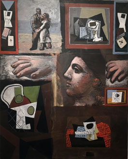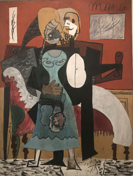 毕加索于1907年创作的《亚威农少女》是第一张被认为有立体主义倾向的作品,它不仅标志着毕加索个人艺术历程中的重大转折,而且也是西方现代艺术史上的一次革命性突破,引发了立体主义运动的诞生。《亚威农少女》开创了法国立体主义的新局面,毕加索与勃拉克也成了这一画派的风云人物。在这幅画中,我们可以看到这些女性似乎是被扭曲着表现出来的,但实际上最左边的带有埃及常有的正面律的姿态,而中间两个人的脸上我们可以看到西班牙古伊比利亚雕刻的痕迹,右边女性则是受到非洲艺术的影响,每个形象都是毕加索深思熟虑而创作出来的,是他在丰富的知识背景下的创新。但非常可惜,在这次展中并没有这张作品。