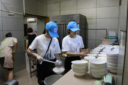 天刚蒙蒙亮,分行实践队员们便来到南苑街道老年食堂,开始准备一天的早餐。洗碗、洗菜、切菜、炒菜……不大的厨房里,满是队员们忙碌的身影。“今天有这么多帮手,我真是高兴!”老年食堂的常驻义工打趣道。