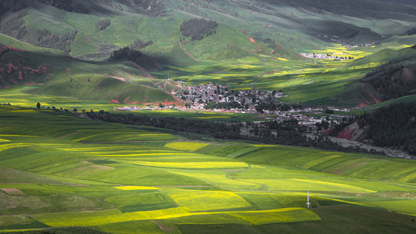 若说碧湖已让我讶异,而西北的高山则更为壮丽。跋山涉水,翻山越岭,我来到青海祁连卓尔山,传说中这里得到了龙界公主与山神的守护,秀美非凡。登上卓尔山,看到周围的高山顶峰上覆盖的雪恰似一袭白色纱裙,轻柔地遮盖住高山上的流石与尘土,更与天上的白云相互掩映。雪峰之下是高山荒漠,荒漠之下是草甸,从白色到深棕色再到灰绿色,层层渐变融汇,棱角隆起处又在背面投下浅黑色的阴影,凸显山体极富层次之美感。再往下则是广阔的针叶林带,密集的树木紧挨在一起,地上仅有被叶子筛下的细细疏疏的光影,暗绿色的一片片针叶林在山间倾泻,仿佛铺下毛茸茸的厚地毯。从针叶林到山麓,竟是一大片黄色的油菜花田,在深色调的山间显得尤为耀目,还混着些许紫色、蓝色的小花,远处看去犹如打翻了的调色盘,阳光的照耀更让这明亮的身姿成为景色的焦点,真是令人感叹一句“恰是山花烂漫时”。山麓边,是呈方块状分布的小城镇,看着城镇里生活着的人们,我着实心生羡慕,一出门,甚至一开窗,壮丽的高山就在眼前,高低起伏,群山环绕,相映成趣,斑斓多姿,怕是古代文人也想要在此隐居吧。