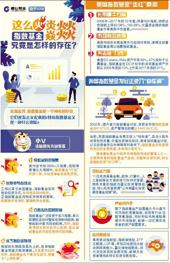 作为标准化工具产品,近年来,指数基金不仅受到机构投资者的青睐,也逐渐成为个人投资者的重要选择。海通证券研究所金融产品研究中心发布的《基金规模数据报告》显示,截至2018年底,全市场指数基金数量达573只,资产管理规模合计已达5449.39亿元。建信基金在指数投资领域前瞻布局,为投资者提供指数投资“工具箱”。
