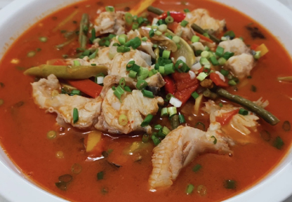 有人说,酸汤不就是强调“酸”嘛,只要味道到位就好了,颜色区别没多大意义。实际上,因原料选材和发酵过程不同,酸汤还有红汤和白汤之分。对贵州人来说,讲究汤底颜色可是品鉴酸汤鱼的出发点,因而有了“不是红汤我不要”“白汤当然不过瘾”的偏爱表达。我满心期待盯住锅底,是念想的红酸汤颜色!慢慢地,那股熟悉的酸辣味儿熬出来了,如同顽童投石一般,放肆散播着它的分子力量,直往我们鼻尖心头窜。起初说好各自下厨呈现交换礼,这一刻变成了全民餐厨总动员,阿姨早已按捺不住,在一旁用料酒腌制好草鱼,等待着下锅的最佳时机。其实煮鱼的步骤十分简单,我们几乎可以用“熬汤、下锅、放料”三步曲来概括,关键就看汤底和鱼肉的“亲密程度”了。肉质较紧的鱼通常入味比较慢,需花时间用文火慢炖,红酸汤才能展示出它“浸透鱼肉、抓牢食客”的真功夫来。