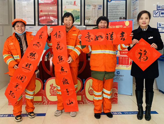 当地电台“生活在丽水”栏目派记者直播连线,现场采访了环卫工人张大姐,“建行把我们当家人看待,腊八节请我们喝腊八粥,今天又叫我们来领春联,我们把这里的‘劳动者港湾’当作自己的家一样,每天都来加水、热饭……太感谢他们了!”一名市民朋友在连线中表示,“我领到了中意的对联,很开心!手写春联带着浓浓的墨香味,仿佛已经感受到过年的味道!”(胡琪盛)