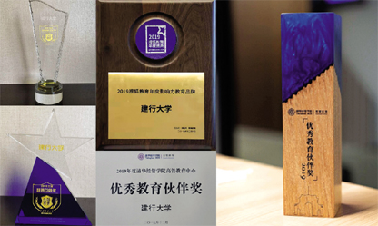 2019年,建行大学荣获中国最佳企业大学排行榜“2019年度中国企业大学趋势引领奖”第一名、“2019年度中国最具影响力企业大学”(唯一一家);荣获搜狐教育“2019年度影响力教育品牌”第一名;荣获南方周末“2019年度责任案例奖(金智惠民)”;荣获清华大学“优秀教育伙伴奖”。