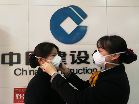 贵州省镇远支行抗疫期间为新员工佩戴口罩,互相加油鼓劲。■张雅妮/摄