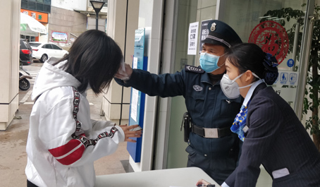 广西区柳州分行网点工作人员对前来办理业务的客户体温测量。■黄彩华/摄