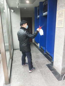 湖南省长沙河西支行工作人员对离行式自助银行消毒。■牛洪柱/摄