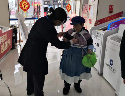云南省分行网点工作人员给前来办理业务的纳西族老人送上口罩。■ 李志刚/摄