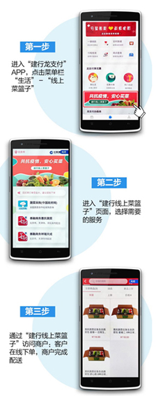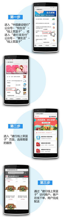 目前,您只需通过中国建设银行相关的服务平台,如中国建设银行微信公众号、龙支付APP、建行龙支付微信公众号等,就可以进人“线上菜篮子”平台;简单几步操作,即可享受“建行菜篮子”带来的便捷和优惠: