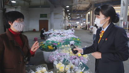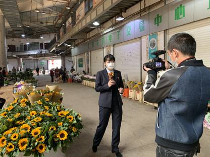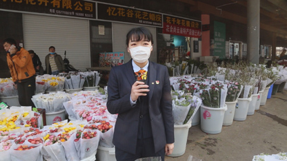 “大家好,这里是建行黔西南分行为您开通的‘当建行大学遇见财私客户’的直播现场,我是建行工作人员李娴静,担任今天现场主播。我们来到云南昆明斗南花卉市场,它是全亚洲最大的鲜花交易市场。通过屏幕显示,现场已有100名客户连线了,让我们携手共赏鲜花、共感春意、共同战疫,加油!接下来由我带领大家一同去欣赏多姿多彩、争奇斗艳、芬芳四溢的斗南花市!我们去看看吧。”