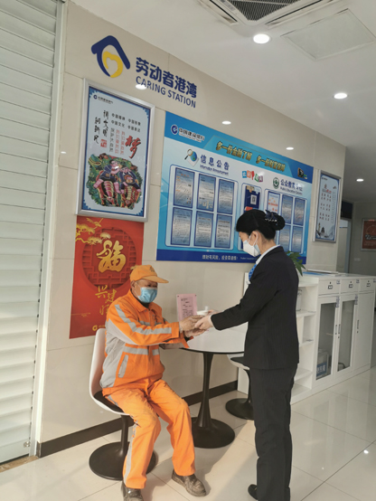 “大爷,您别在地上坐着,快来我们‘劳动者港湾’歇歇脚吧。”