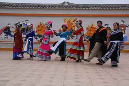 彝族村民在分行捐赠修建的文化广场上载歌载舞。
