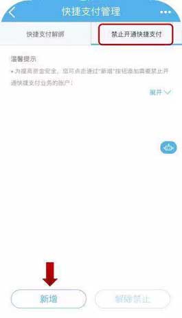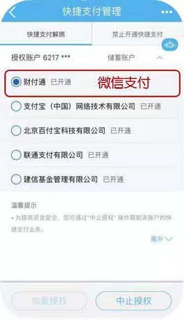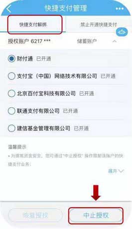 登录手机银行,通过“快捷支付管理—快捷支付解绑”,选择对应的第三方快捷支付,再点击“中止授权”。或者点击“禁止开通快捷支付—新增—禁止开通”即可。
