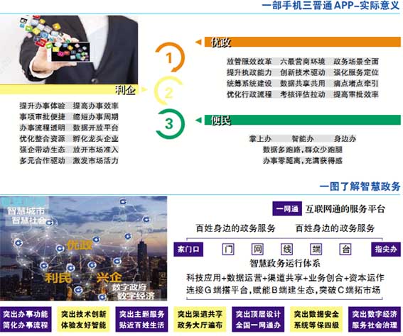 政务服务“掌上办”。APP实现了全省统一,五级联动,“一平台、一张网”,同类事项无差别受理、同标准办理,真正实现“只跑一次”甚至“不见面审批”,百姓可一次完成跨部门、多事项的随手办、随处办、随时办,真正实现让群众找政府办事,像网购一样便利。