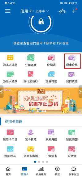 或登录建行手机银行,点击【信用卡】-【现金分期】。
